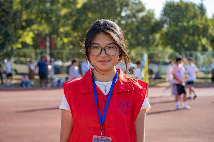 接着我们采访到了在跳高场地旁举着旗帜为运动员加油的胡文静同学。胡文静同学来自材化学院2023级无机非金属材料工程专业,在采访中,她笑着对我们说道:“我自己体育基础不太好而没有参与到运动比赛中,但我很想在力所能及的范围内为大家做些别的事情,而志愿服务对我来说是一次非常好的机会。”胡文静同学为能完成志愿工作做好了前期准备。如平衡好自己的时间,保证运动会期间能够随时在场;与学院成员一起采购运动员补充体力的物资等。她同我们说道,最重要的一点就是保证休息,这样的话第二天才有充足的精力去服务运动员们。在她看来,志愿服务是一份光荣的工作,她想为学校与学院尽一份自己的力量。在志愿活动中,胡文静同学也收获了很多,她说“一些从未有过交集的人,通过这项活动而相识相知,不失为一段美好的经历。”胡文静同学向我们分享了一些在志愿活动中难忘的瞬间,一位同学在上一轮的跳高环节中发生失误,可大家仍然为他呐喊鼓掌,这份感情深深打动了她,这也充分体现了“友谊第一,比赛第二”的体育精神。胡文静同学的额头上布满了细密的汗珠,但她仍然在为跳高选手们加油鼓劲,她的热情比这阳光还炽热,令我们不禁敬佩。