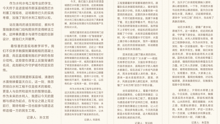 日记里,既有对水利设施细节的精准描摹;也有对专业问题的深度思考,如针对混凝土裂缝成因的分析、对自动化监测系统的优化构想,字里行间满是理论与实践碰撞的火花。团队还在日记中特别记录工作人员的经验之谈,将“水利工程三分建七分养”等行业箴言与课堂知识对照,形成独特的 “实践知识库”。这些日记不仅是个人成长的印记,更成为团队协作的纽带。每日晚间的组会上,成员们交流心得、互补视角,将碎片化观察整合为系统认知。正如团队成员在日记结语中所写:“笔端划过纸面的痕迹,亦是知识扎根实践的深度。”