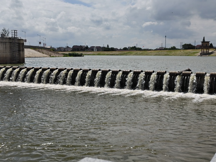 离开管理房,团队前往拦河坝现场深入考察。在观察闸室、消力池等结构时,师生发现闸门间卡有枯木,工作人员通过调节闸门水流成功疏导,让同学们实地见证闸门运行的稳定性。针对“输水管道进口为何设滤网”的疑问,余金煌教授与方佩佩老师详解:滤网可截留杂质,避免管道堵塞与设备磨损,生动诠释工程设计的细节考量。同时,团队也留意到工程现存缺陷,如混凝土细微裂缝、钢筋外包混凝土施工质量隐患等,师生就此展开热烈讨论,深化对工程耐久性的理解。行程中,团队还在河上游发现小型水工建筑物,通过平面钢闸门与控制房的联动原理,进一步掌握水位与流量调节机制。最后,无人机俯瞰视角下,拦河坝与水面、周边设施相映成景,让同学们深刻感悟水利工程平衡生态与民生的智慧,为第一天实践画上圆满句号。