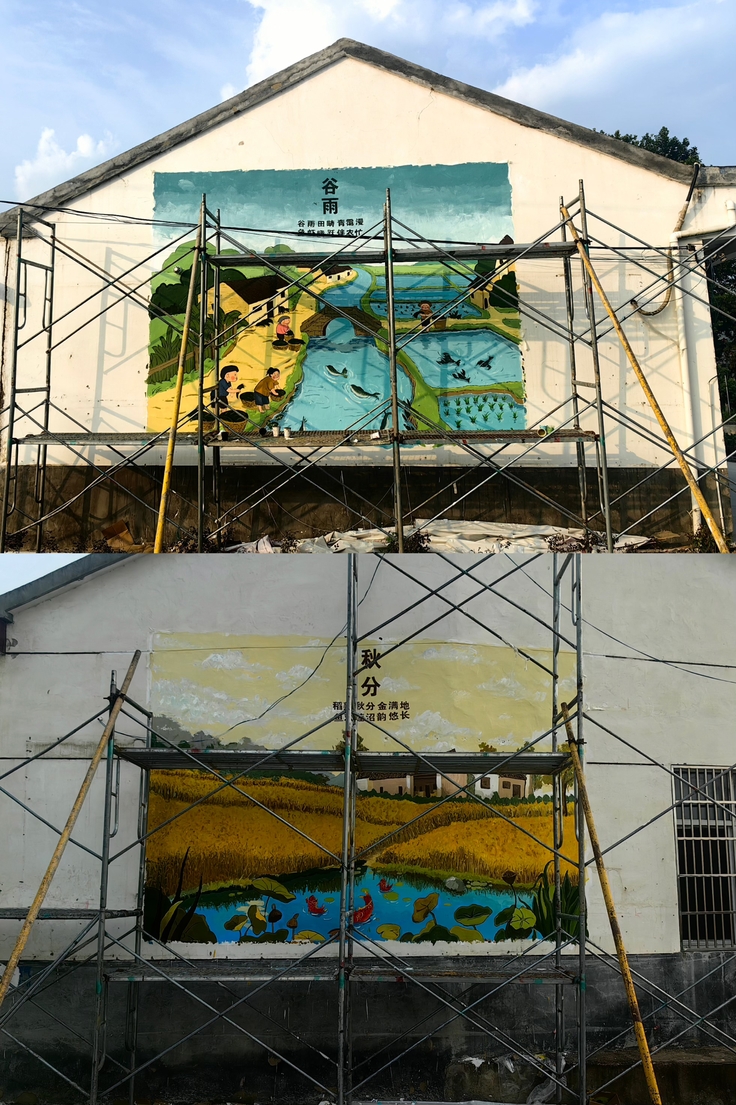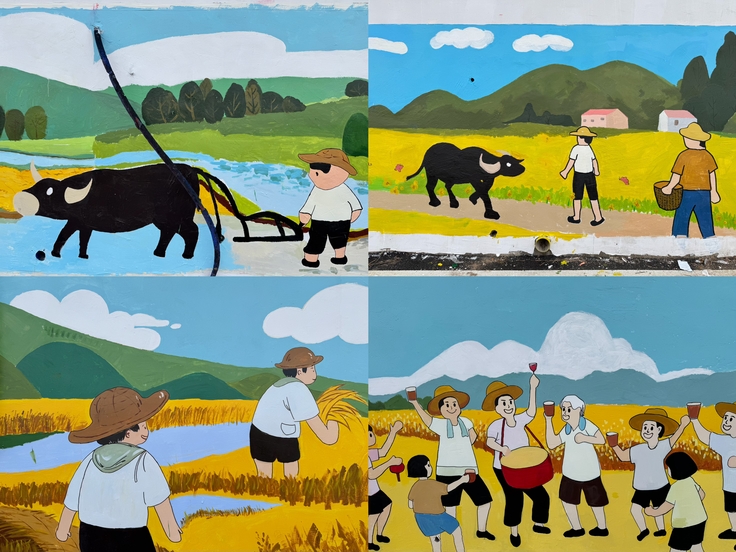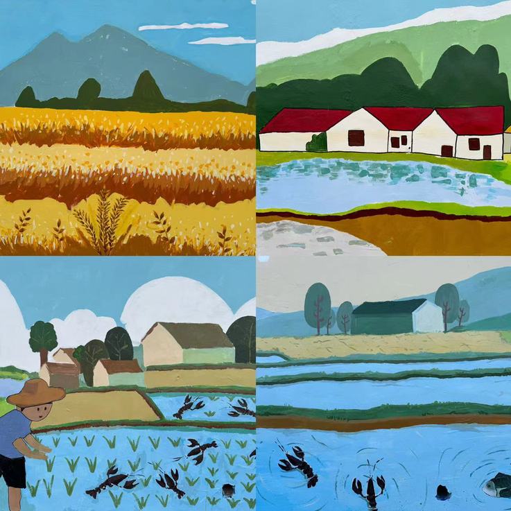 针对当地“稻虾共作”特色产业,师生创作《二十四节气图》,《夏至》插秧、《秋分》收虾的场景细腻鲜活,让村民倍感亲切。
