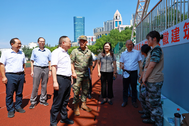 军训训练场青春飞扬、口号嘹亮。高跃峰学院领导和老师的陪同下,看望金寨路校区2025级新生军训新生。现场,身着迷彩服的新生们精神抖擞,在教官的带领下高声传唱《强军战歌》;尽管额头的汗水顺着脸颊滑落,他们依旧保持着挺拔的姿态。高跃峰亲切慰问正在参训的新生和带队教官,仔细询问军训科目安排、后勤服务保障及新生适应,提醒教官科学施训、劳逸结合,确保军训安全有序开展。