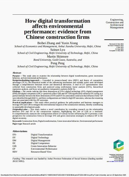 本网讯 近日,我校经济与管理学院硕士研究生熊雨欣发表了题为“How digital transformation affects environmental performance: evidence from Chinese construction firms”的研究成果。论文刊于英国Emerald出版社出版的工程管理领域国际权威期刊《Engineering, Construction and Architectural Management》。该期刊为SCI/SSCI双检索期刊,位列中科院二区、JCR一区,近5年平均影响因子为4.7。论文指导老师为章蓓蓓教授,熊雨欣为第二作者,欧美黑人巨大videos精品_欧美黑人巨大xxxxx_欧美黑人乱大交_欧美黑人乱大交_欧美黑人牲交videossexeso_欧美黑人添添高潮a片www_欧美黑人添添高潮a片www_欧美黑人性暴力猛交喷水黑人巨大经济与管理学院为第一完成单位。